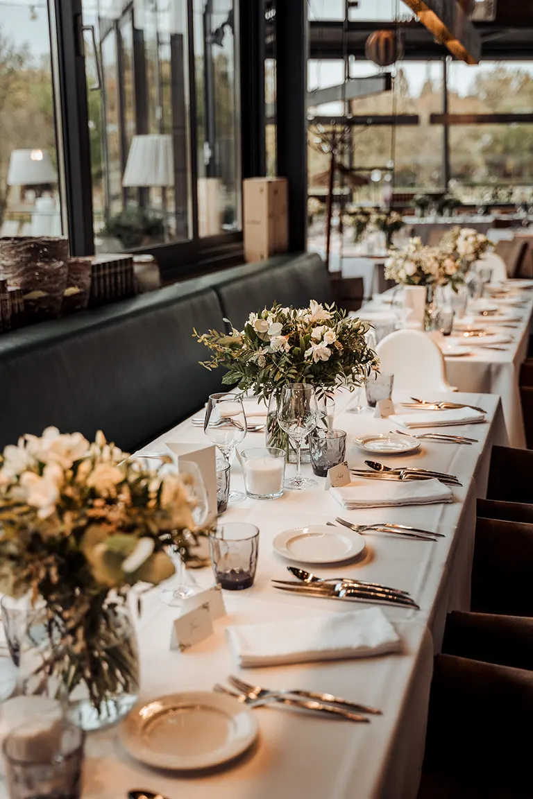 Our restaurant area, which was completely renovated in 2025, is characterized by a fresh, natural design and can be a great option for both smaller private and business events, and it also offers a view of our show kitchen.